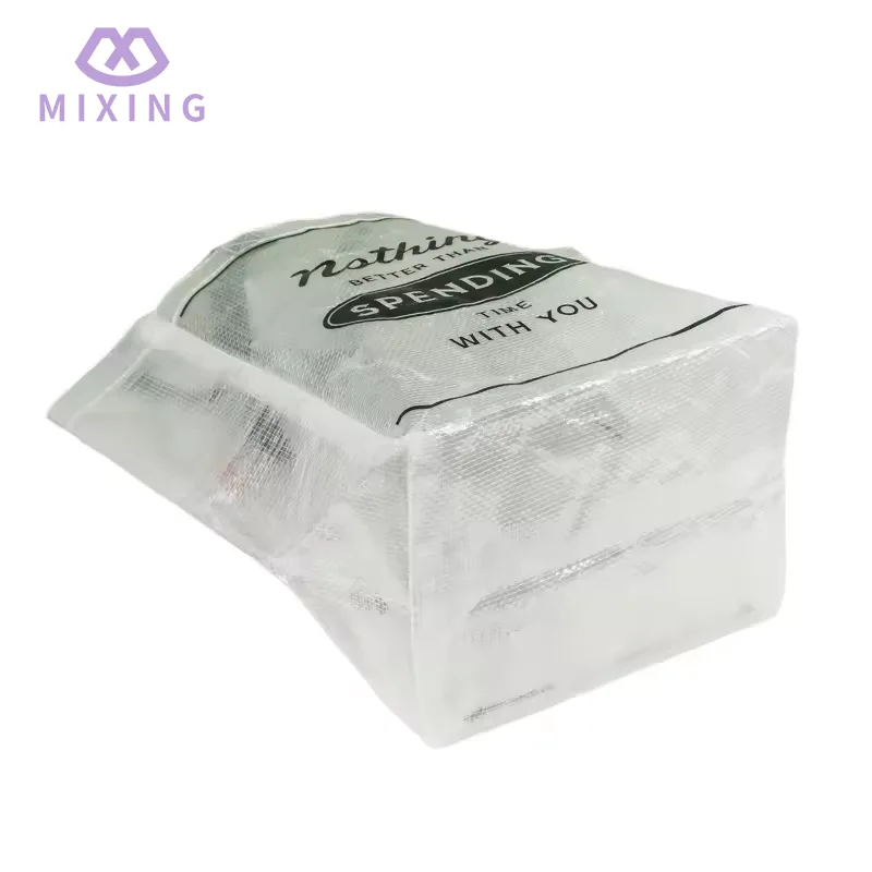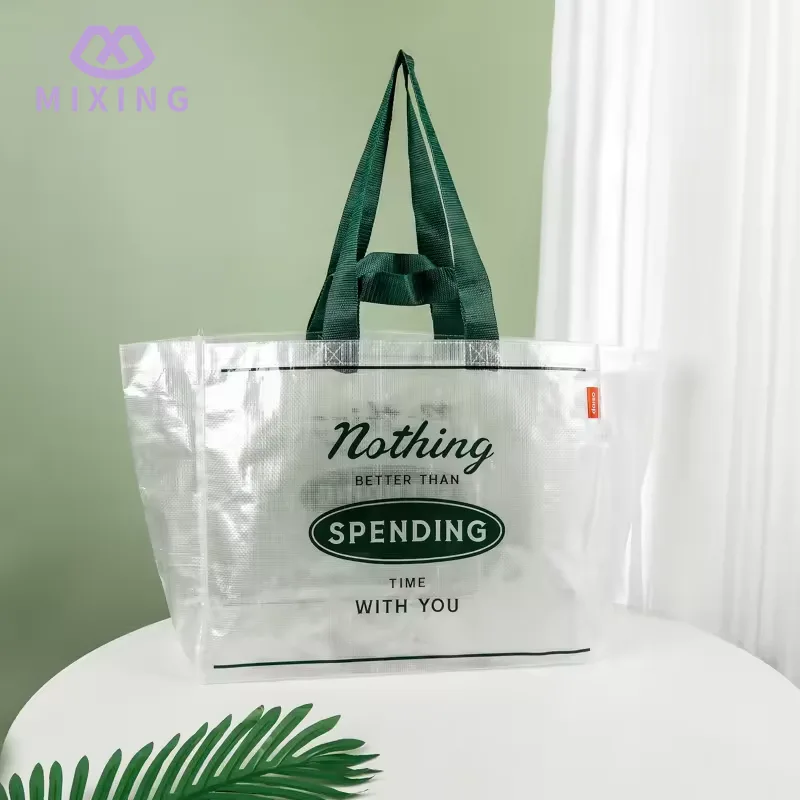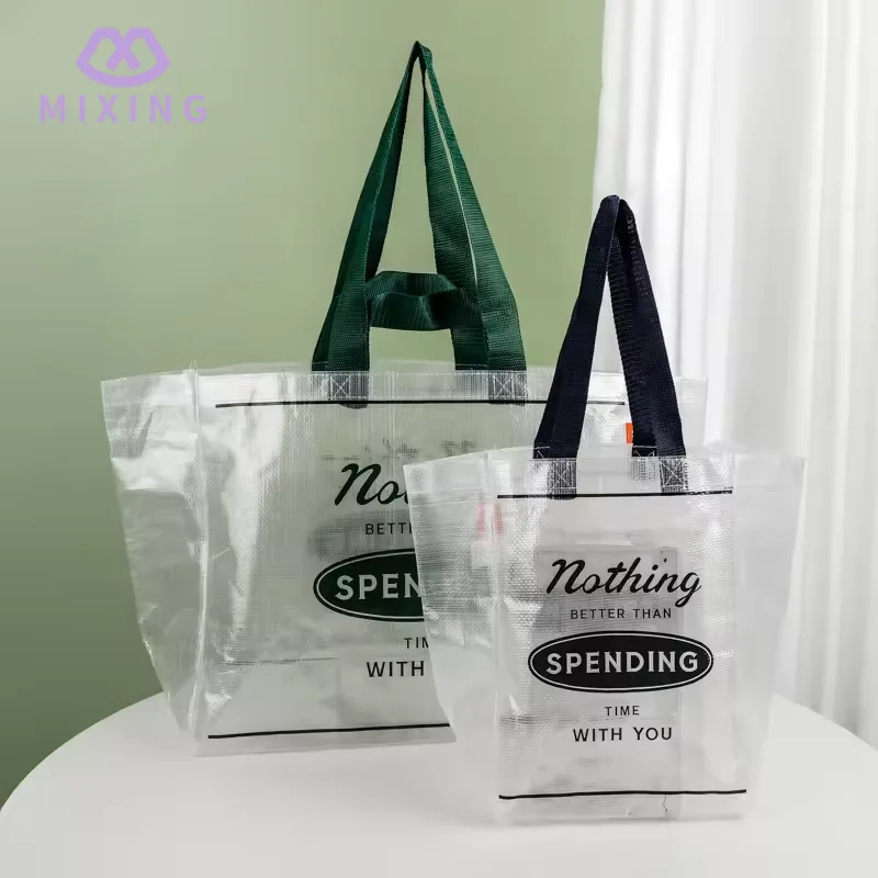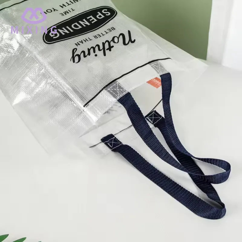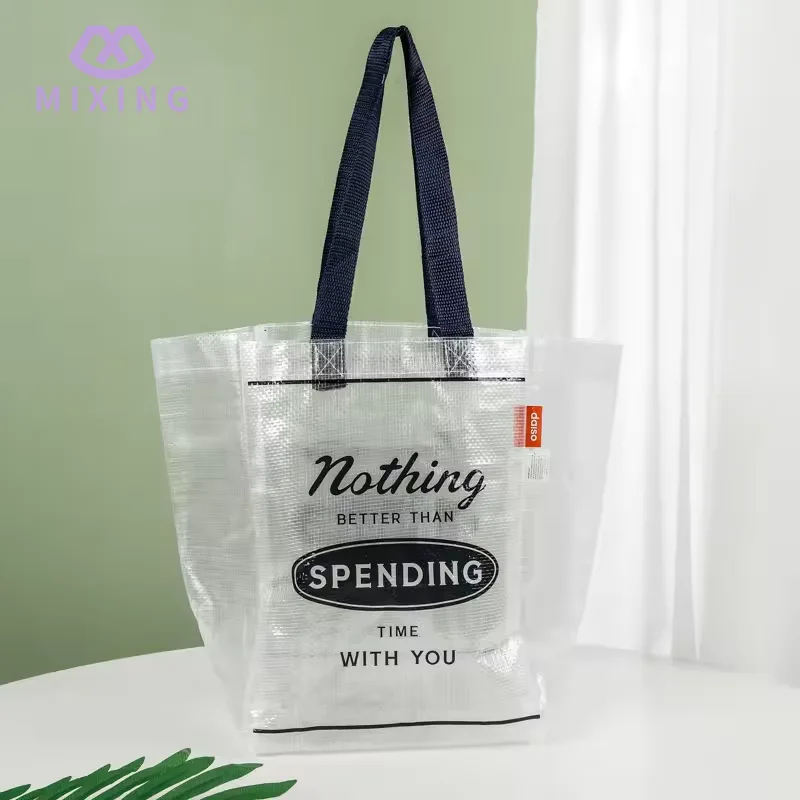 Den handbärande delen av Mixing 's China Clear PP Woven Tote Bag är designad med en breddad nylonrem, nylonmaterialet har en måttlig mjukhet och lämnar inte märken vid kontakt med handen. Den bärande prestandan har testats många gånger och kan stabilt stödja utan deformation.