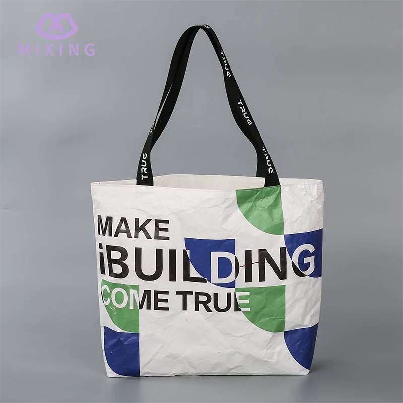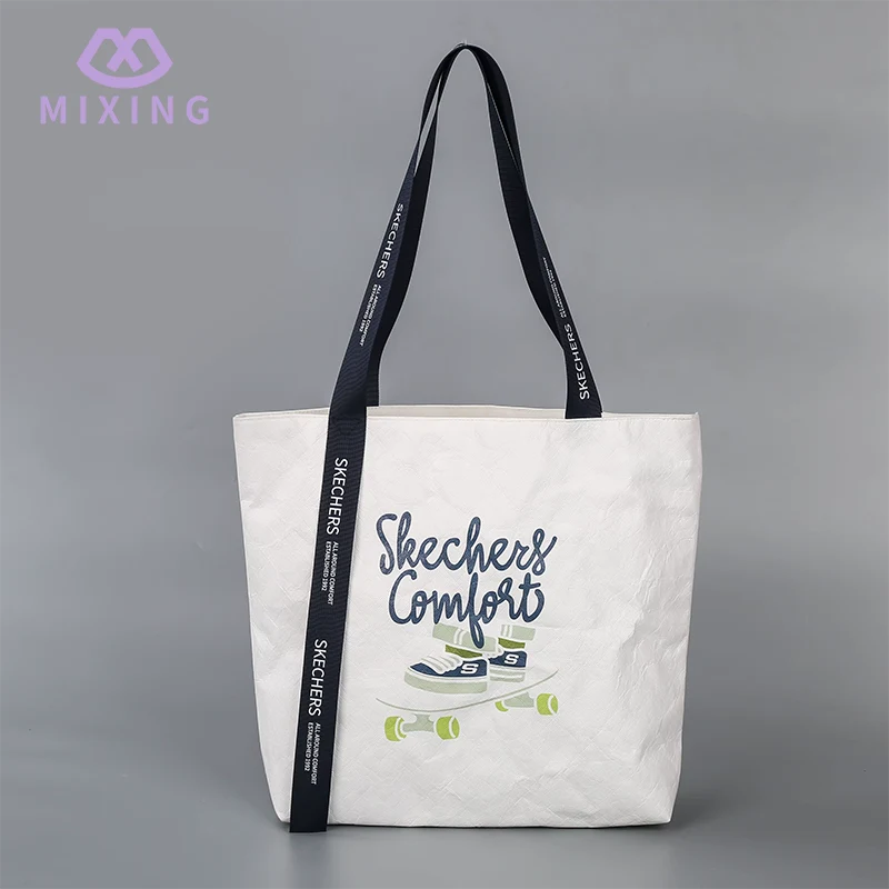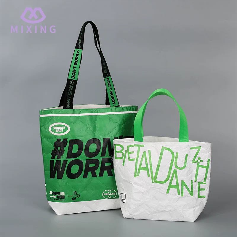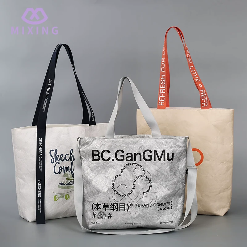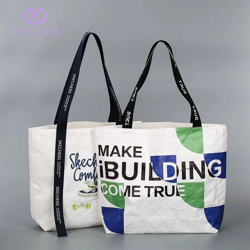 Logotypen för Mixing 's Tyvek Bags With Logo är antingen varmstämpling eller silkscreentryck, som kan väljas beroende på färg, det är inte de billiga klistermärkena eller bläckstråleskrivare. Den heta stämplingslogotypen känns något ojämn vid beröring och tappar inte bläck när den gnuggas mot kläder eller bordet. Logotypen tryckt med silkscreen är ljusare i färgen och matchar bakgrundsfärgen på väskan mycket bra. Det kommer inte att finnas några feljusteringar eller suddiga kanter. Även om väskan är i en ljus färg kan logotypen fortfarande visas tydligt och kommer inte att se gråaktig ut.